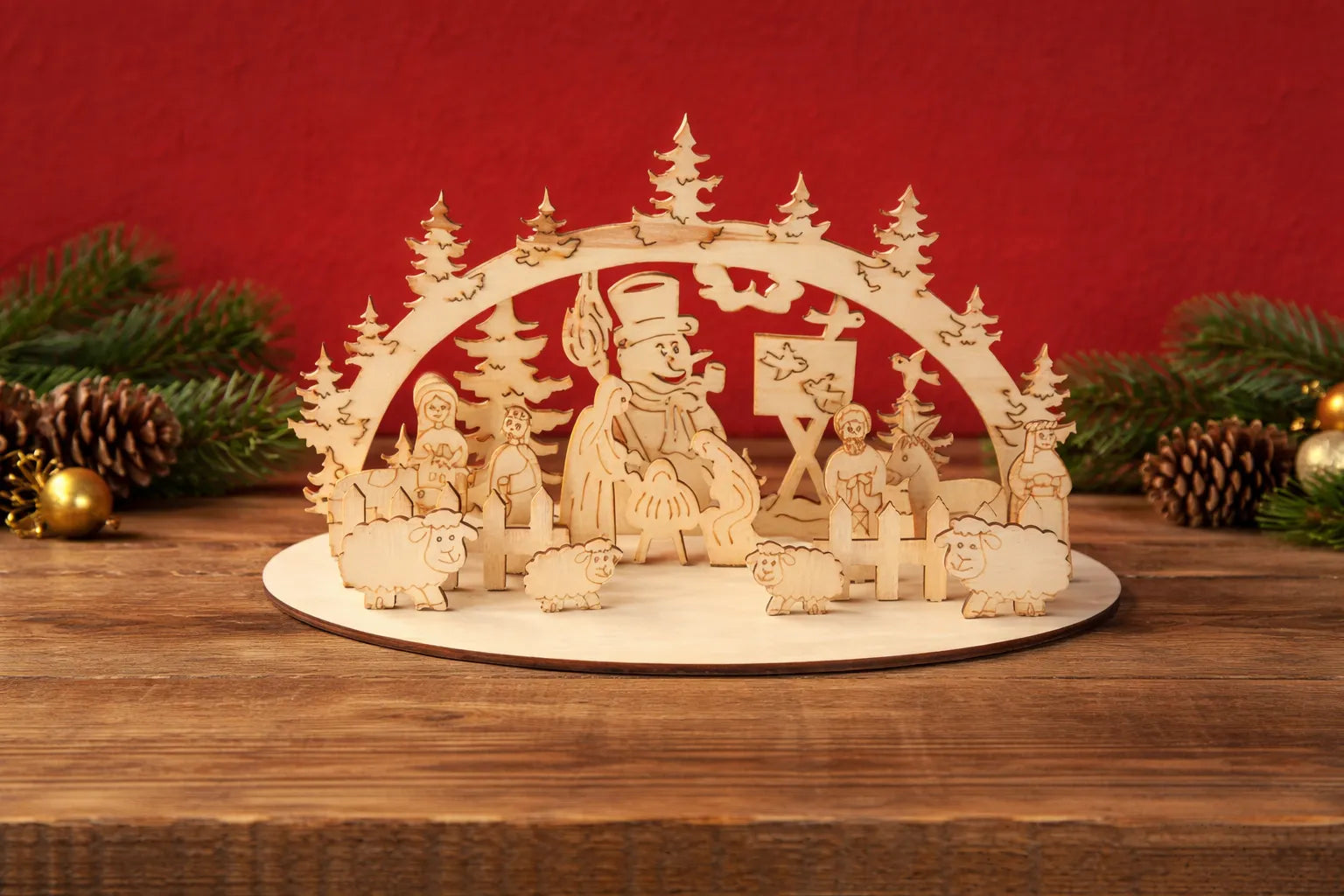 🎄Cette décoration en bois représente une scène de la Nativité avec des personnages, des moutons et des sapins. Le bois clair et les formes découpées donnent un style simple et chaleureux.